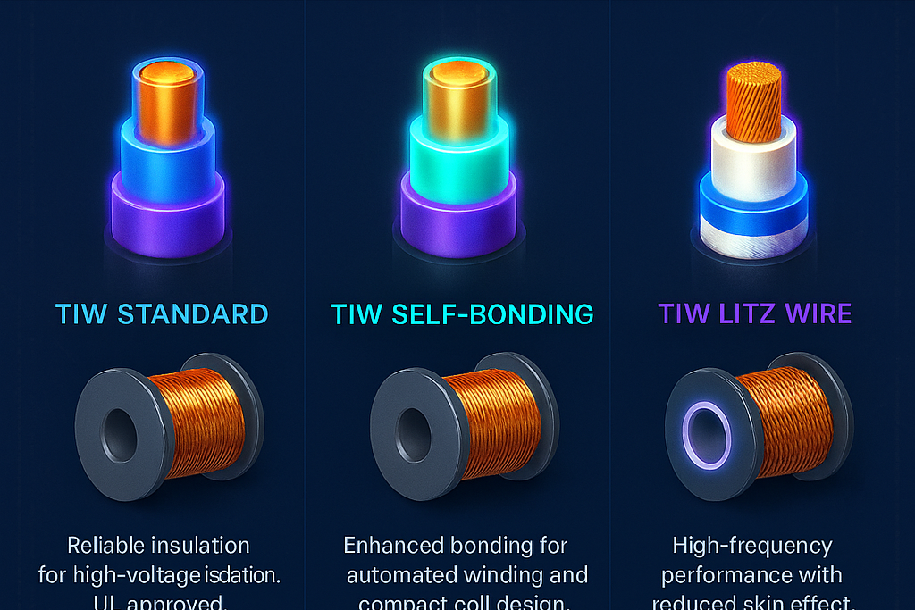Halogen Free PEEK wire TIW Winding wire Insulated wire Lead wire Hook up wire Common Mode Choke Wrapped wire Coils Dielectric strength Electric vehicles Formed litz wire High frequency Magnetic field Motor windings Partial discharge Profiled litz wire Q value Self bonding Self bonding litz wire Taped litz wire Litz wire High frequency Polyimide overlap Taped litz wire NEMA UEW